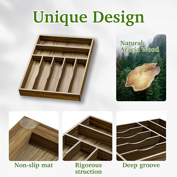 - ๐๐๐ญ๐ฎ๐ซ๐๐ฅ ๐๐๐๐๐ข๐ ๐๐จ๐จ๐-Made of acacia wood, this silverware drawer organizer is very attractive, well made and easy to clean. More resistant than plastic and other materials. The color of natural wood is so beautiful and rich.