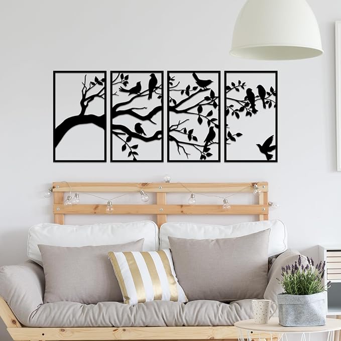 ruelen Wall Decor 4 Pieces Large Metal Birds and Branch Wall Art, Tree of Life Metal Wall Art, Black Leaves with Birds Silhouette Hanging Wall Sculpture For Indoor Home Bedroom Living Room Outdoor