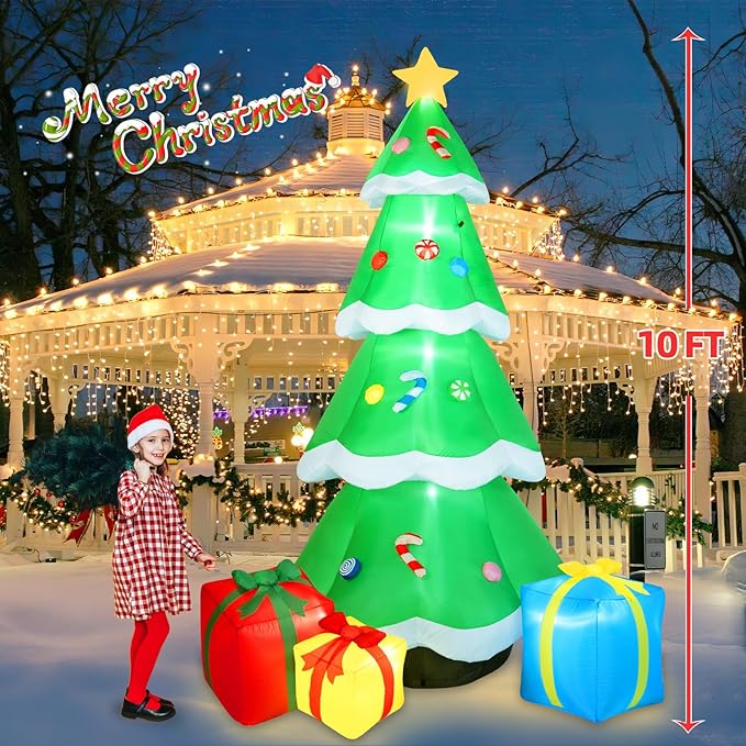 - Classic Christmas Decorations: Cheer the Xmas holiday with B&D 10FT giant inflatable Christmas tree! This Christmas inflatables feature various of charming Xmas elements like star, colorful candy canes and gift boxs, giving your garden a joyful festive vibes. Built-in 7 ultra bright LED lights, blow up Christmas tree creates a bright and glowing nighttime display that easily attracts the attention of guests and kids, definitely makes your house more popular and unique during the holiday season