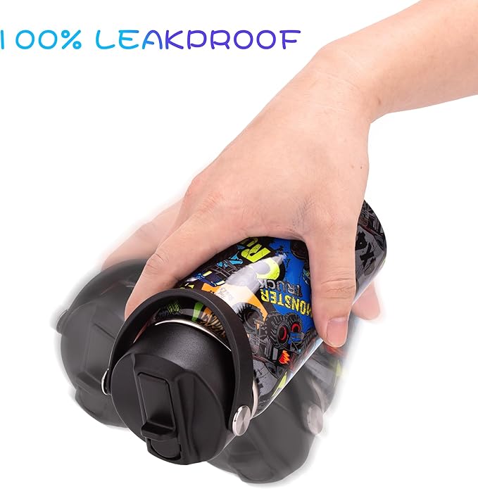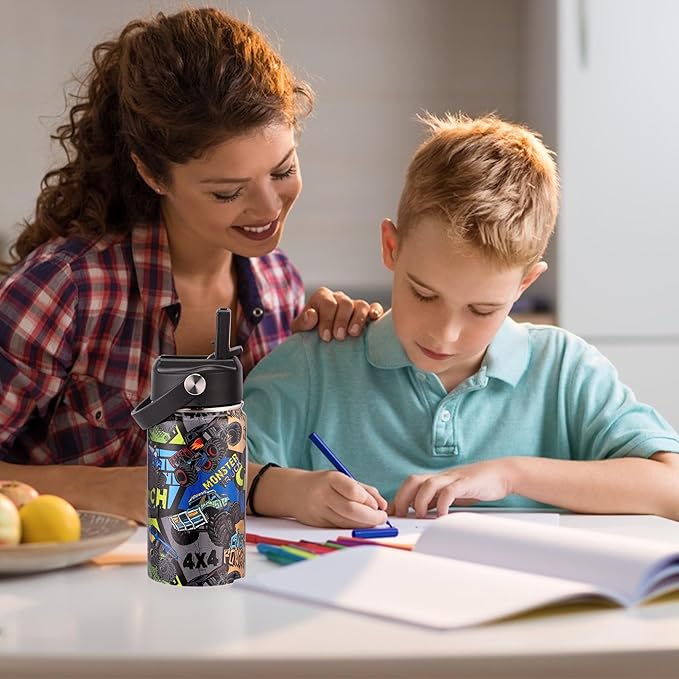 12oz Kids Insulated Water Bottle with Flip Straw & Big Handle, Monster Truck, Double Wall 18/8 Stainless Steel, Leakproof Gift for Kids Boys to School Travel Sports, Hands Wash Only, Black