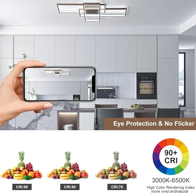 - ADJUSTABLE COLOR TEMPERATURE & BRIGHTNESS: The modern ceiling light fixture is equipped with a remote control that can adjust the color temperature (3000K-6500K) and brightness (10%-100%), and has a memory function that automatically saves the last used setting, making it more convenient to use