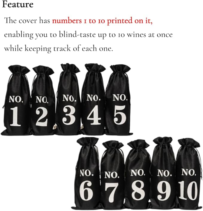 - Numbered Design - Each wine cover is printed with numbers ranging from 1 to 10, providing a clear and organized way to identify each bottle during a blind tasting session. This feature eliminates confusion and allows tasters to focus on their observations without being influenced by labels.