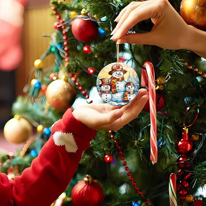 Snowman Family Ornament Round Ceramic Stained Glass Style Ornament Xmas Keepsake for Christmas Tree Winter Holiday Xmas Gift for Women Men Xmas Hanging Ornament 3"