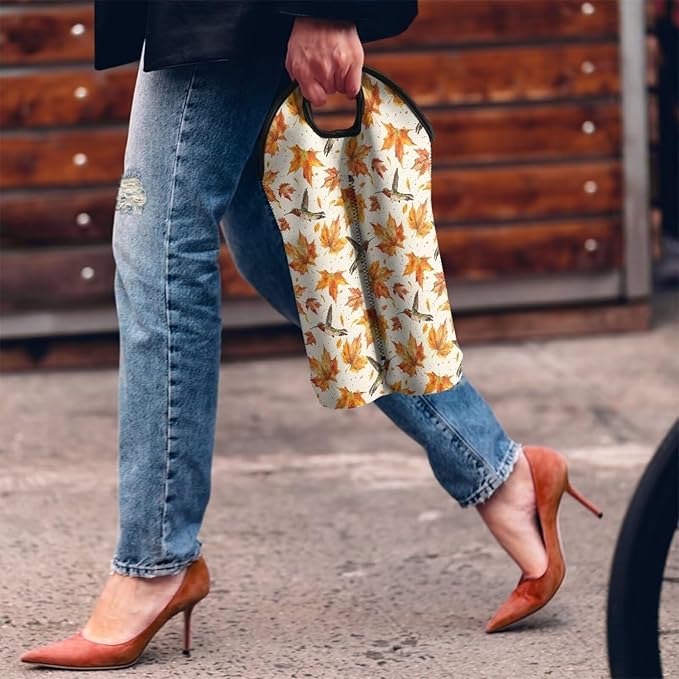 doginthehole 2 Bottle Wine Carrier Tote Fall Maple Leaves Hummingbirds Print Wine Bag 750ML Portable Neoprene Wine Bottle Travel Protector Champagne Bag with Handle for Picnic, Thanksgiving Party