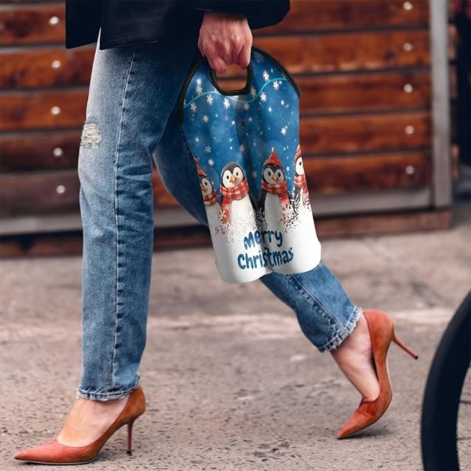 doginthehole Merry Christmas Wine Carrier Tote Bag for 2 Bottles Cute Penguin Neoprene Wine Bottle Holder with Carry Handle, Wine Protective Bag Beer Cans Water Bottle Holder for Travel Picnic