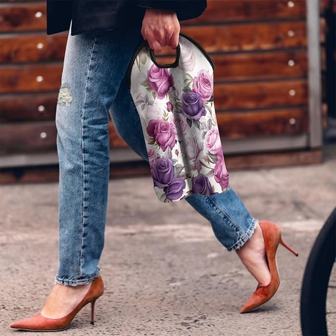 doginthehole 2 Bottle Wine Carrier Bag, Retro Purple Pink Rose Pattern Neoprene Wine Tote Bag with Handle, for Travel, Wine Tasting Party, Champagne/Beer/Drinks Carriers Bag for Wine Lover