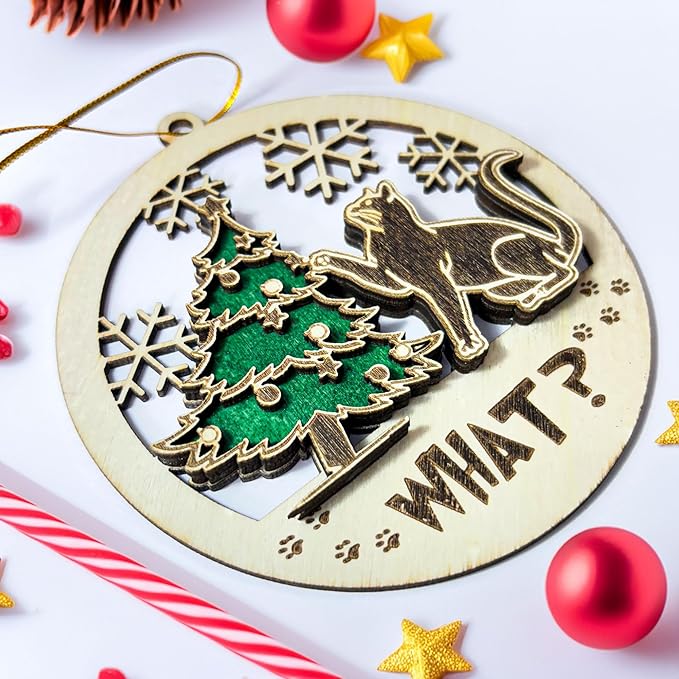 Black Cat Wooden Ornament - Funny Kitten and Christmas Tree Decoration