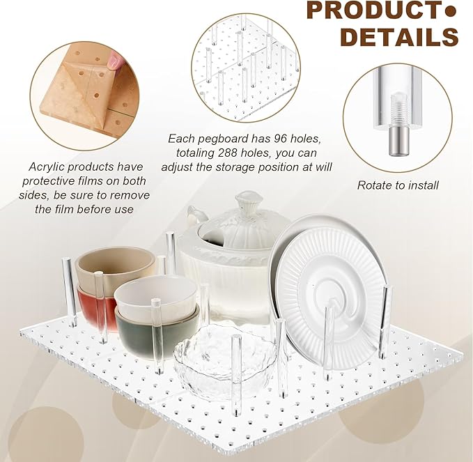 - Quality and Durability: experience outstanding durability with our clear pegboard drawer organizer; Crafted from the acrylic sheet, this peg drawer organizer ensures long lasting use; Its transparent color also adds a touch of elegance to your space; Acrylic products have protective films on both sides, be sure to remove the film before use