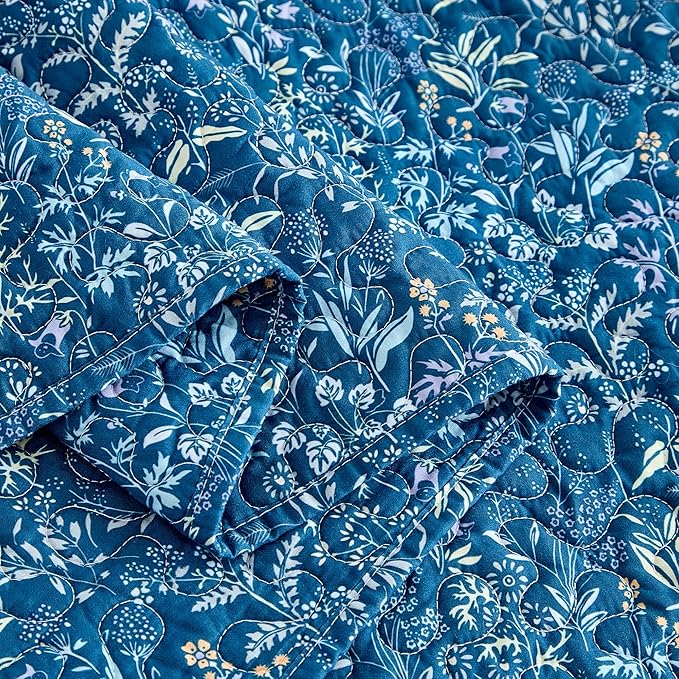 mixinni Navy Blue Quilt Set Queen Size, Garden Style Floral Bedding Set, 3-Piece Lightweight Quilted Bedspread Coverlet Set for All Season