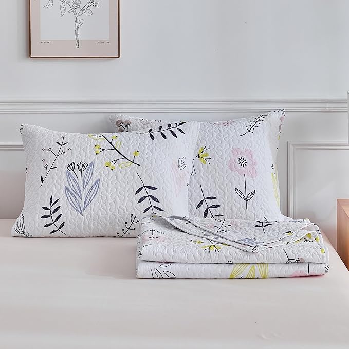 mixinni 3-Piece Quilt Set Flower Leaf Bedspread Lightweight Coverlet Set Garden Style Floral Printed Farmhouse Quilted Bedding Set with Shams for All Season, Queen Size