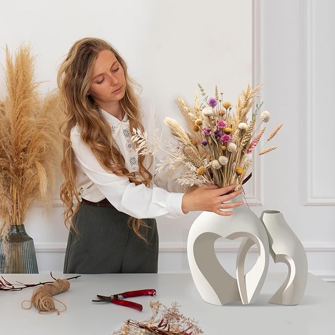 White Vases for Decor, Heart Shaped Ceramic Vase Set of 2, Nordic Modern Heart Vases, Minimalist Decorative Vase for Table Centerpiece Wedding Living Room House Decoration