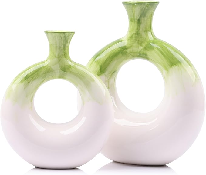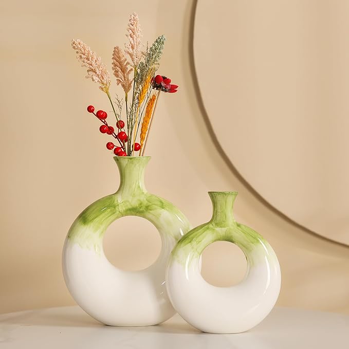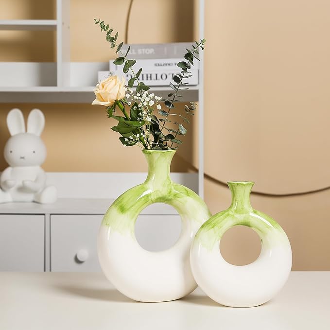 Ceramic Donut Vases Set of 2, Green and White, Perfect for Home Decor, Modern Boho Style, Ideal for Centerpieces and Dinner Tables