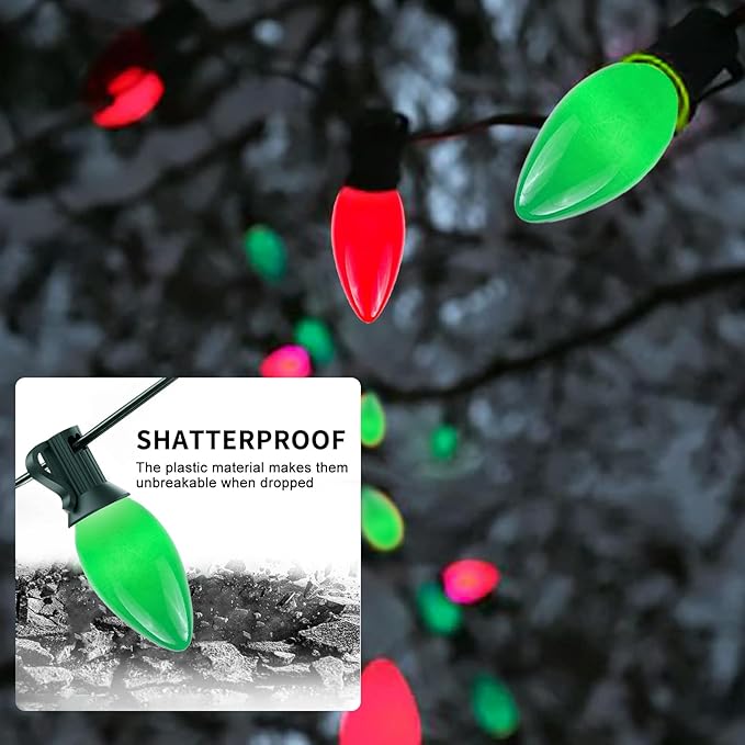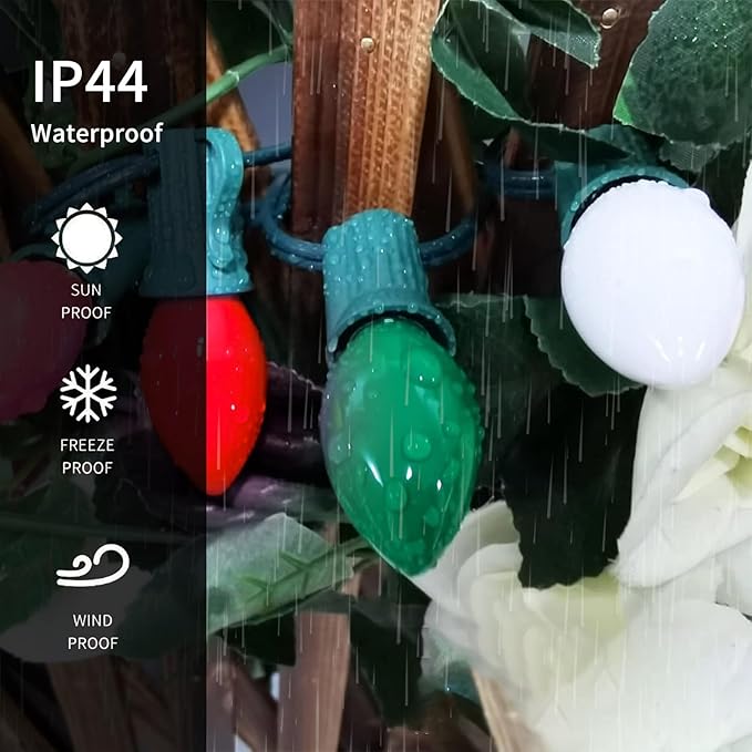 - Connectable Up to 28 Strings: Each red white green LED C9 string lights set can be easily connected to up to 28 additional strings. This feature is perfect for decorating large areas, such as your home exterior, trees, and fences, providing a seamless and continuous light display