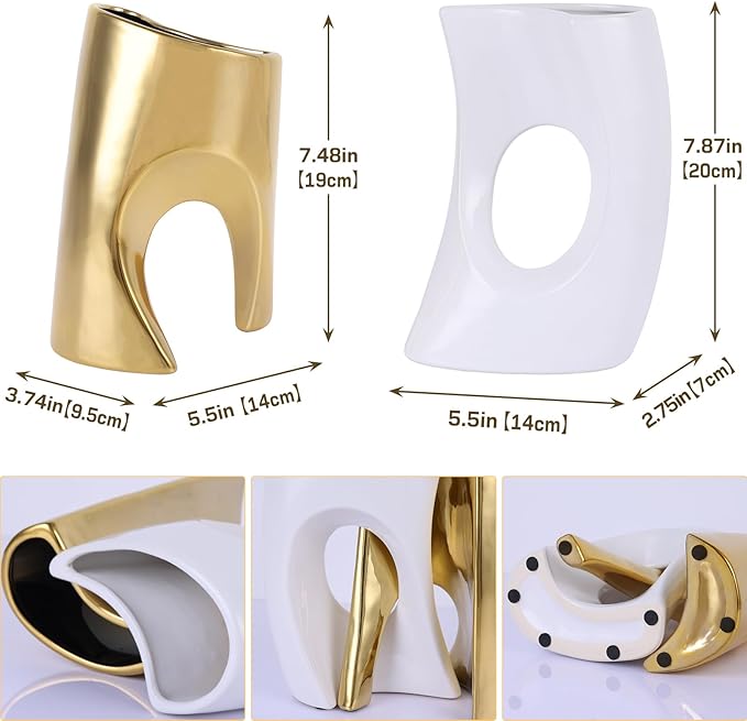 - [Unique Abstract Design] This modern flower vase stands out with its bold, abstract design that combines a sleek white ceramic body with a striking gold accent, creating a visual masterpiece. Its artistic shape resembles a donut vase with an open center, adding a contemporary touch that suits various decor styles, from mid-century decor to boho aesthetics. This funky vase is perfect for those who appreciate distinctive art-inspired pieces.