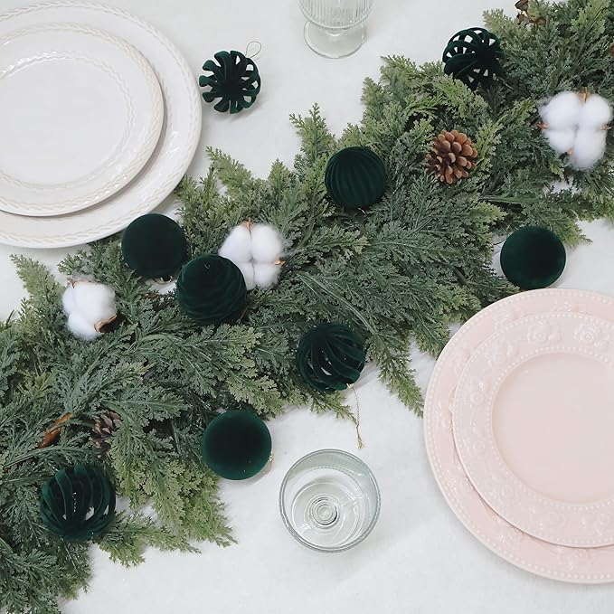 Senjie 9 PCS Velvet Ornaments for Christmas Tree 4inch Flocked Christmas Balls Assortment for Xmas Tree Holiday Decor Deep Green