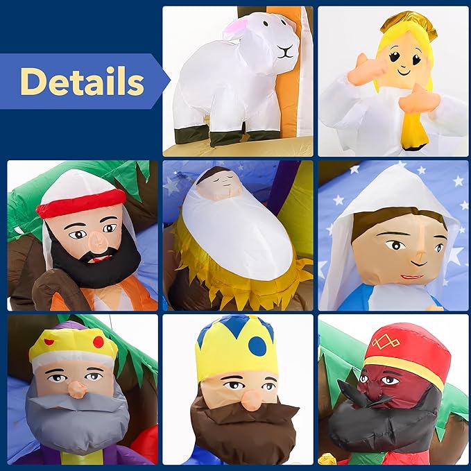 - Celebrate the Spirit of Christmas: Immerse yourself in the true magic of Christmas with this 8.5-foot Nativity Scene inflatable, featuring Mary, Joseph, the Three Wise Men, an angel, and animals gathered in reverence. This stunning and heartwarming display, illuminated by bright LED lights, brings warmth, joy, and hope to your home, creating a centerpiece that inspires your family, friends, and neighbors throughout the holiday season.
