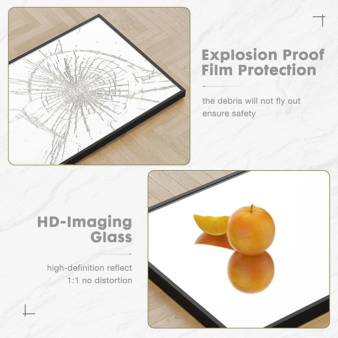 - 【UPGRADED NANO GLASS】Crafted from 3mm high-definition nano glass, our large mirror offers enhanced clarity and durability. The upgraded nano glass with a pure silver layer ensures better definition and increased break resistance. In the event of accidental damage, the mirror's broken pieces will not shatter or scatter, making it safer to use.