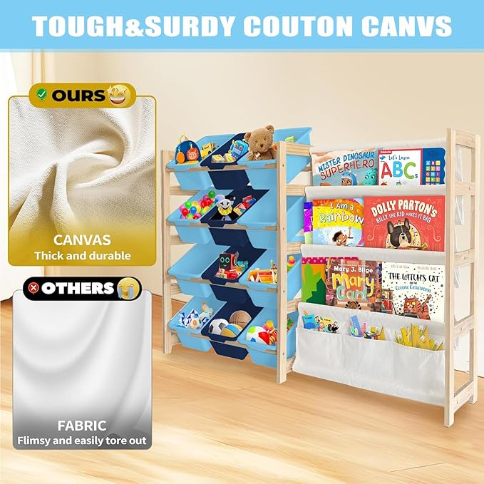 - STABLE STRUCTURE & EASY ASSEMBLING: This kids toy storage shelf applied with thickened pine wood and 0.7 inch solid wood pole, easy assembling and more stable structure. The kids bookshelf adopts stronger and wear-resistant cotton linen material for durable and attractive.