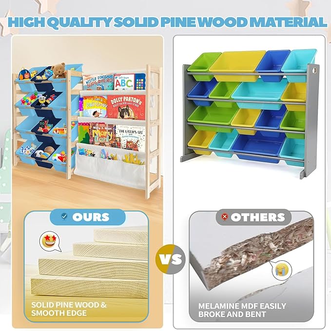 - NATURAL SOLID WOOD: Not like Melamine MDF as unpleasant smell, easily broke and bent, the broken residue will hurt children, this kids toy storage with bookshelf is selected with high-quality natural solid pine wood which can completely eliminate these problems, it's durable and safe; paint-free design without any irritating and harmful odor.