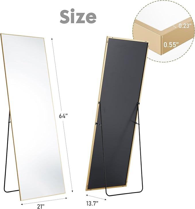 - 【LARGE SIZE】Measuring 64" in length and 21" in width, this full-length standing mirror offers ample reflection space, allowing you to view your entire figure with ease. More than just a functional body mirror, it also serves as a stylish art piece, adding a touch of elegance to your home and enhancing your mood daily.