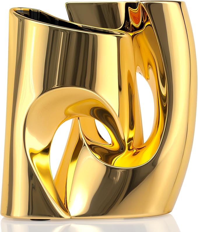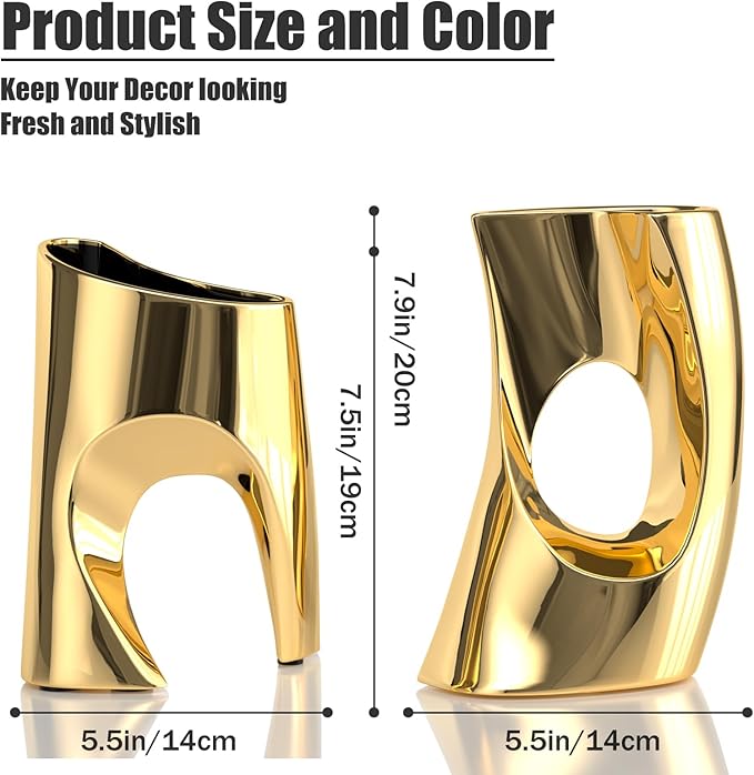 Ceramic Vases Set of 2 - Modern Vase for Nordic Minimalist Book Style Shelf Decor, Hollow Round Pampas Flower Vases for Boho Home Wedding Party Room Dinner Table Shelf Decor (Gold)