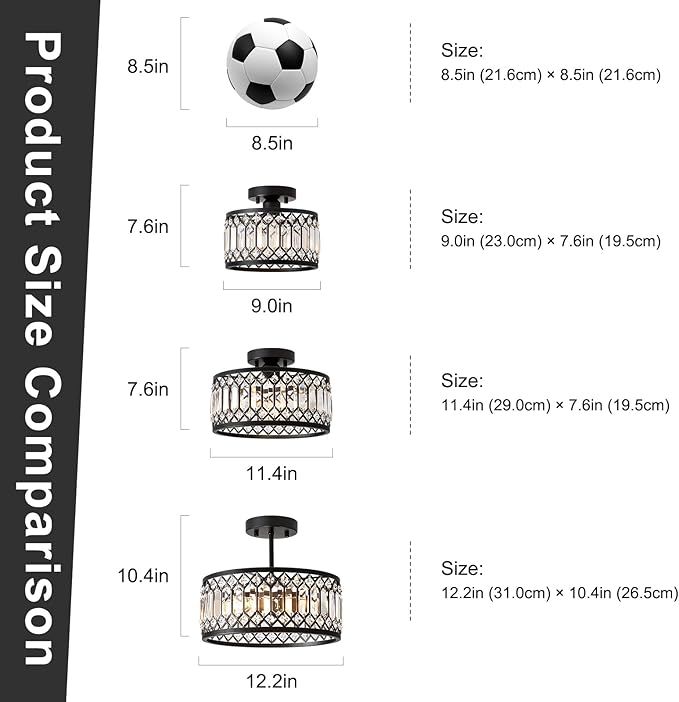 - Size and Material: The crystal semi flush mount ceiling light size is 9.05 in X 7.67 in, The hallway light fixture overall made of metal and crystal