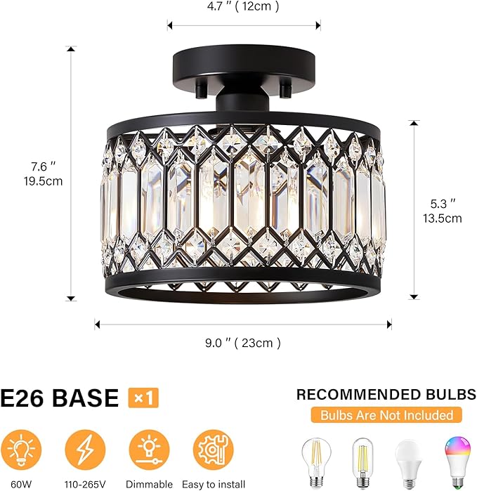 - E26 Bulb Base and Dimmable: The modern crystal ceiling light compatible with E26 bulb x 1(max 60 watts), compatible with incandescent, LED, CFL, etc. When the dimmer switch and the dimmer bulb is used, this ceiling lighting fixture can be fully dimmable(Bulbs and dimmer switch NOT included)