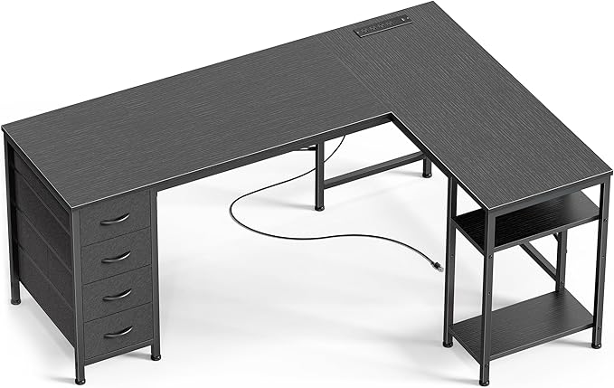 - 【L Shaped Desk with Power Outlet】Built-in power outlet with 4 AC outlets, 1 USB port, and 1 USB-C port on the l shaped desk with drawers keeps your laptop, phone, tablet, desk lamp, and even a Bluetooth speaker all powered up, no more messy extension cords or crawling under the office desk