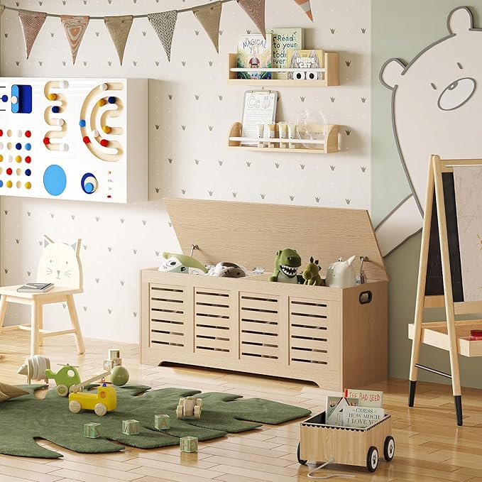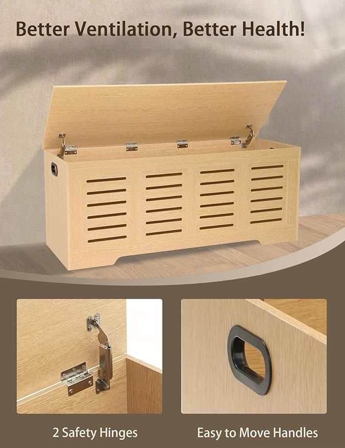 - 【2 Hinges for Added Safety】The sturdy wooden storage chest features 2 safety hinges, holding the lid open and close slowly and smoothly. The lid can stay open at any angle without risk of slamming shut or pinching fingers. 2 cut-out handles allow you to easily move around