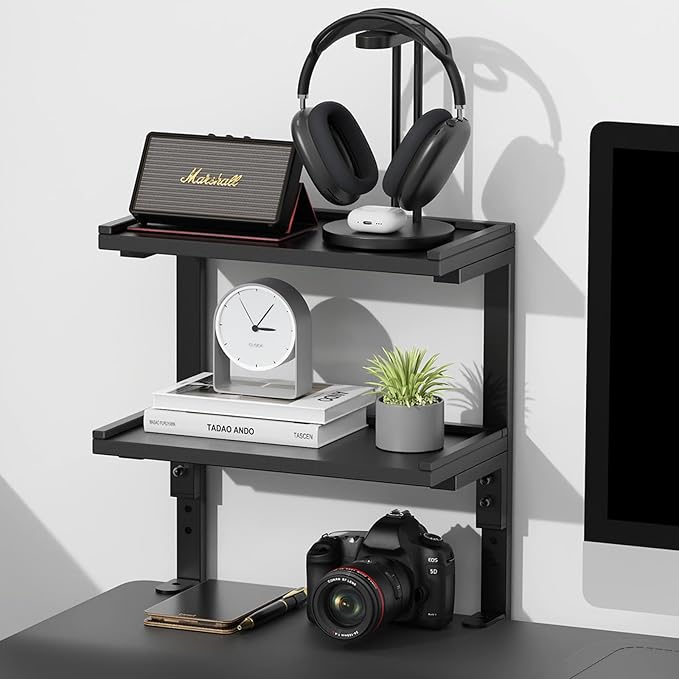 2-Tier Desk Shelf, Expandable Under Desk Storage, Clamp on Desk Shelf, Desktop Accessories for Offices, Study Rooms, and Game Rooms (Black)