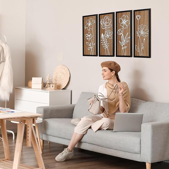 Wesiti 3D Wooden Floral Wall Art Set of 4 Lightweight Ready to Hang Framed Flower Wall Decor for Living Room Bedroom Office Boho Botanical Rustic Farmhouse Decorations Gift Boxed