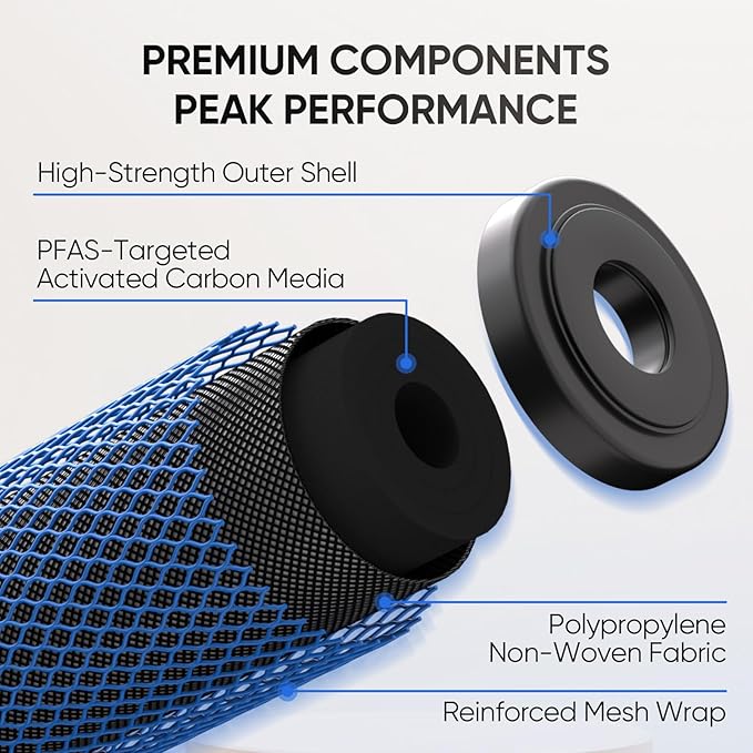 - ❄️ Specialized PFOA/PFAS Removal Technology: Crafted with specially treated adsorption media, the PFO filter is designed to capture and eliminate persistent organic pollutants such as PFOA and PFAS from water. Paired with a high-performance activated carbon layer, it significantly enhances the purification of VOCs and other chemical contaminants, ensuring water safety and quality.