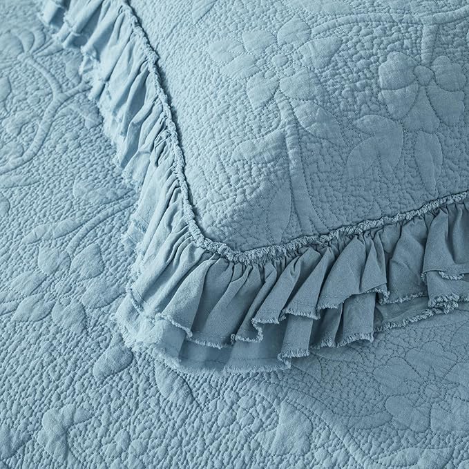 Brandream Queen Size Quilt Set Cotton Blue Quilts Shabby Chic Bedding Romantic Ruffle Bedspread Matelasse Coverlet Set 3-Piece