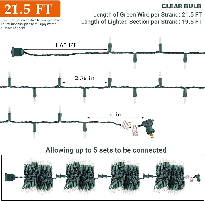 - Green Wire Christmas Lights: Our 2 pack 100-count clear warm white incandescent mini lights will brighten up your home this Christmas. Each bulb is spaced 2.36 inches apart. A built-in 3A fuse ensures safe operation, and extra bulbs and fuses are included for replacements. These high-quality UL-certified lights prioritize the safety of your family