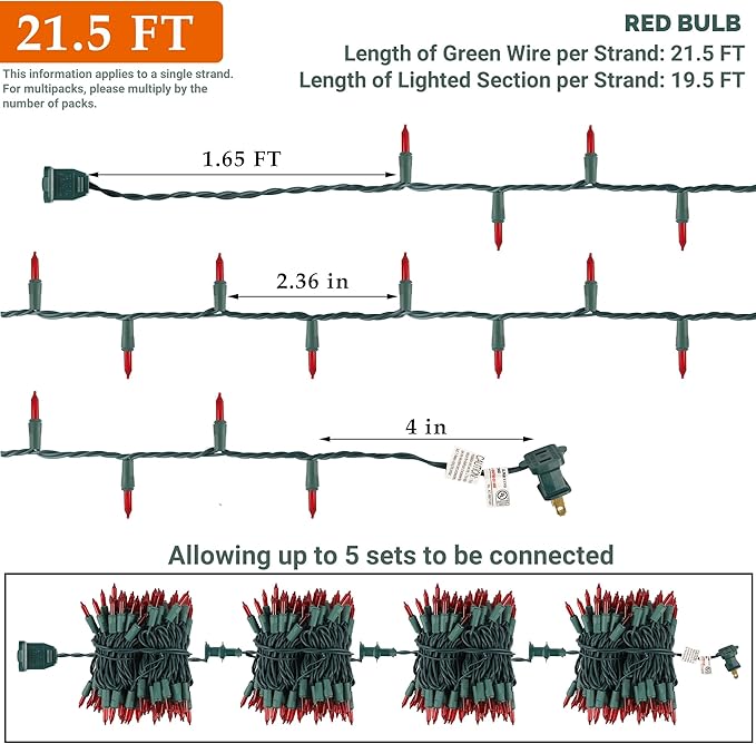 - Green Wire Christmas Lights: Our 2 pack 100-count red incandescent mini lights will brighten up your home this Christmas. Each bulb is spaced 2.36 inches apart. A built-in 3A fuse ensures safe operation, and extra bulbs and fuses are included for replacements. These high-quality UL-certified lights prioritize the safety of your family